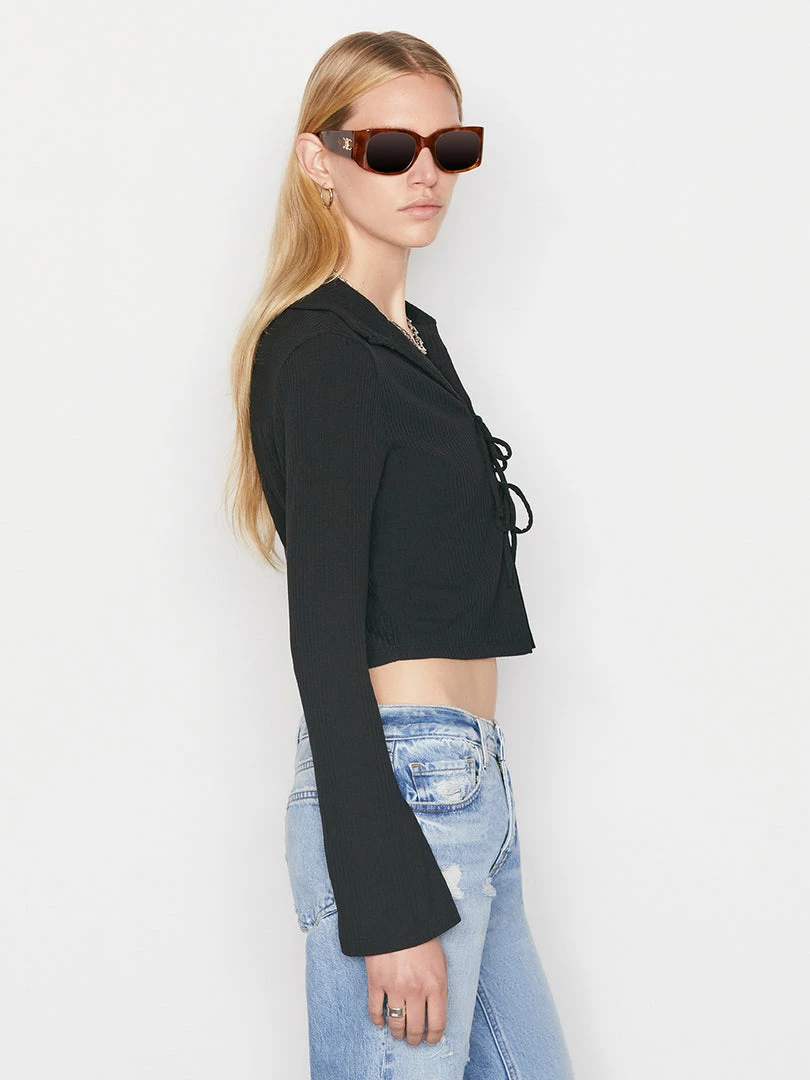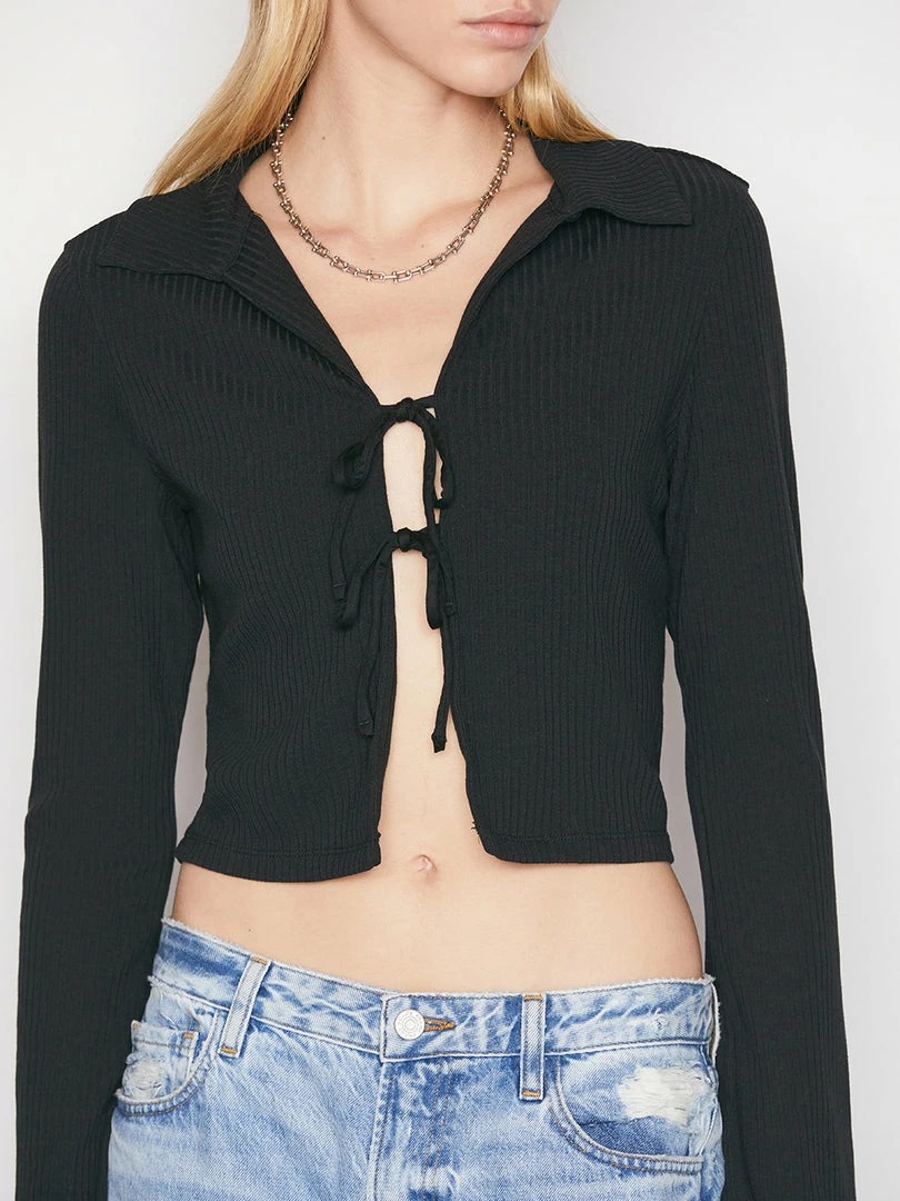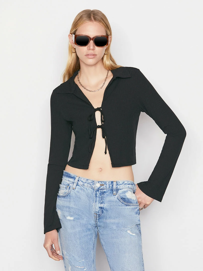 Luxuriously soft with a microrib texture, this cropped polo features two delicate ribbon ties. Style this piece solo for understated allure, or over a bodysuit or bralette to add feminine polish to your summer uniform. The flared bell sleeve gives this top a vintage feel, especially paired with wide-leg denim.