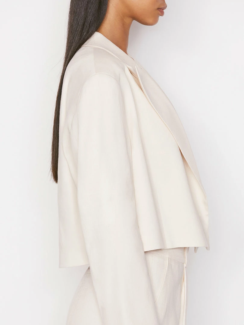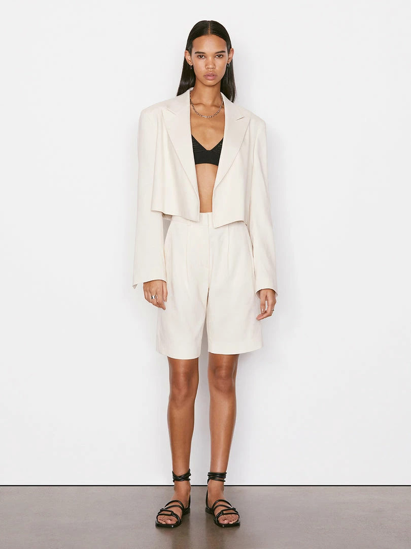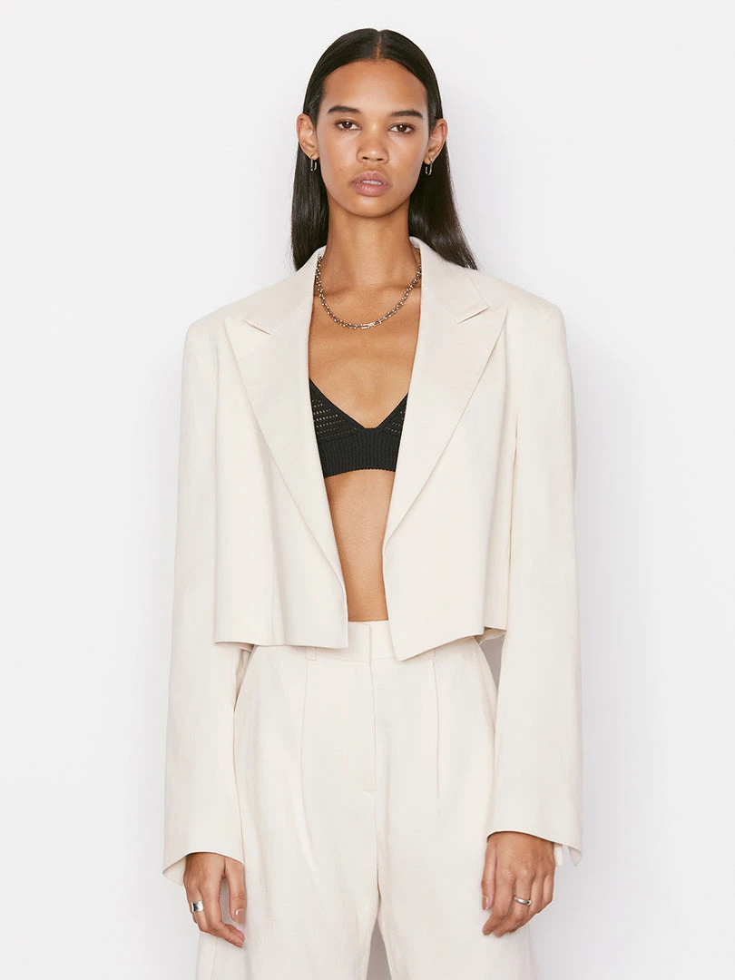 Crafted from wrinkle-resistant linen, this cropped single-breasted blazer embodies modern suiting style paired with Bermuda shorts or trousers in the same eco-friendly fabric, or pair with denim or over a minidress for a polished look. Closure-free for a sleek profile.