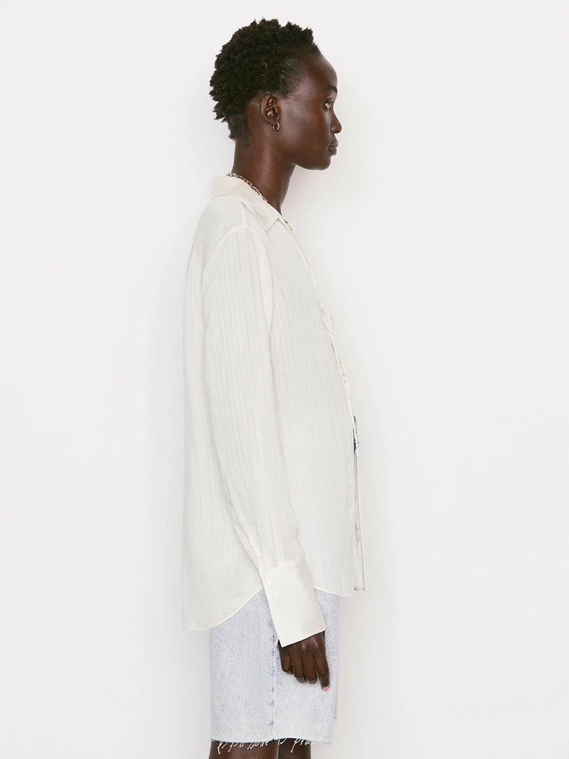Modern femininity embodied in a blouse: Delicate and silky with a subtle shadow stripe, this full length blouse features two delicate spaghetti strap ties and a shirt-tail hem. Gorgeous solo or styled under a blazer.