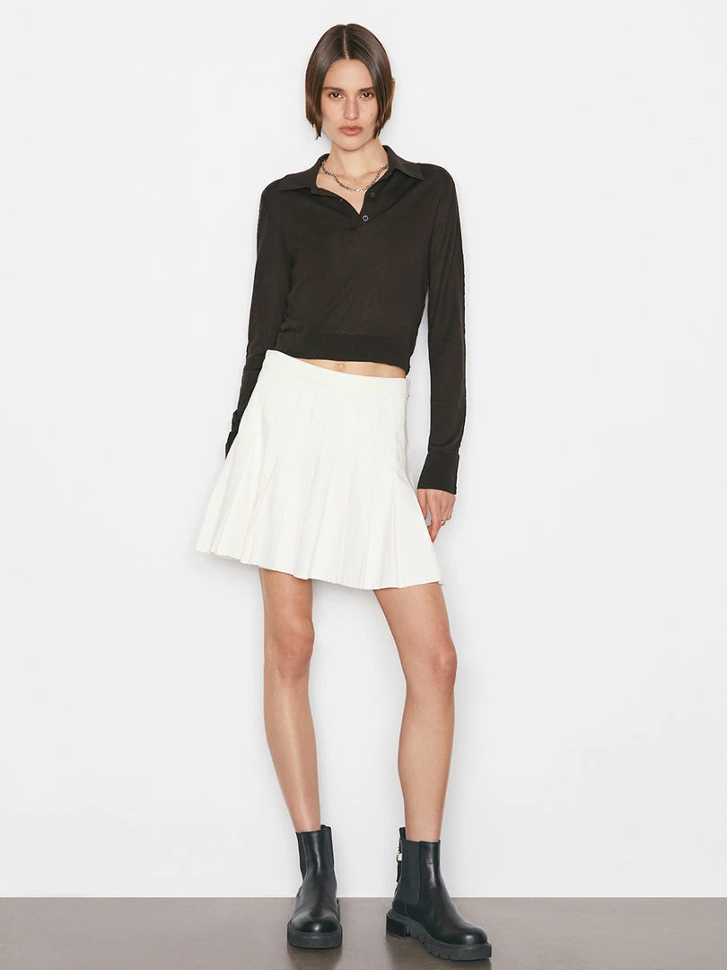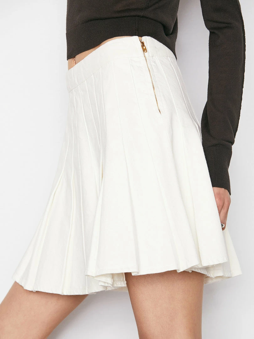 Hold court in this seasonβs take on the tennis trend. Cut from rigid denim made from sustainable materials and responsibly washed to an off-white neutral hue, this pleated skirt sets you up for winning looks all summer long.