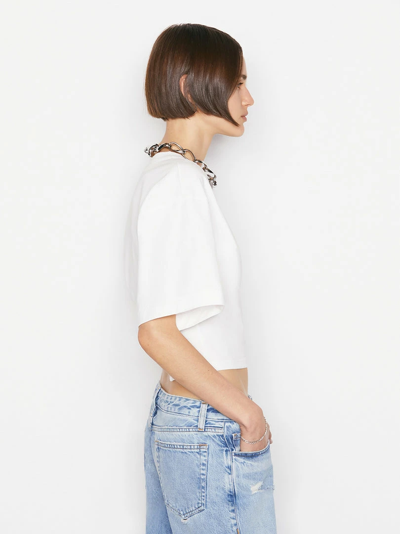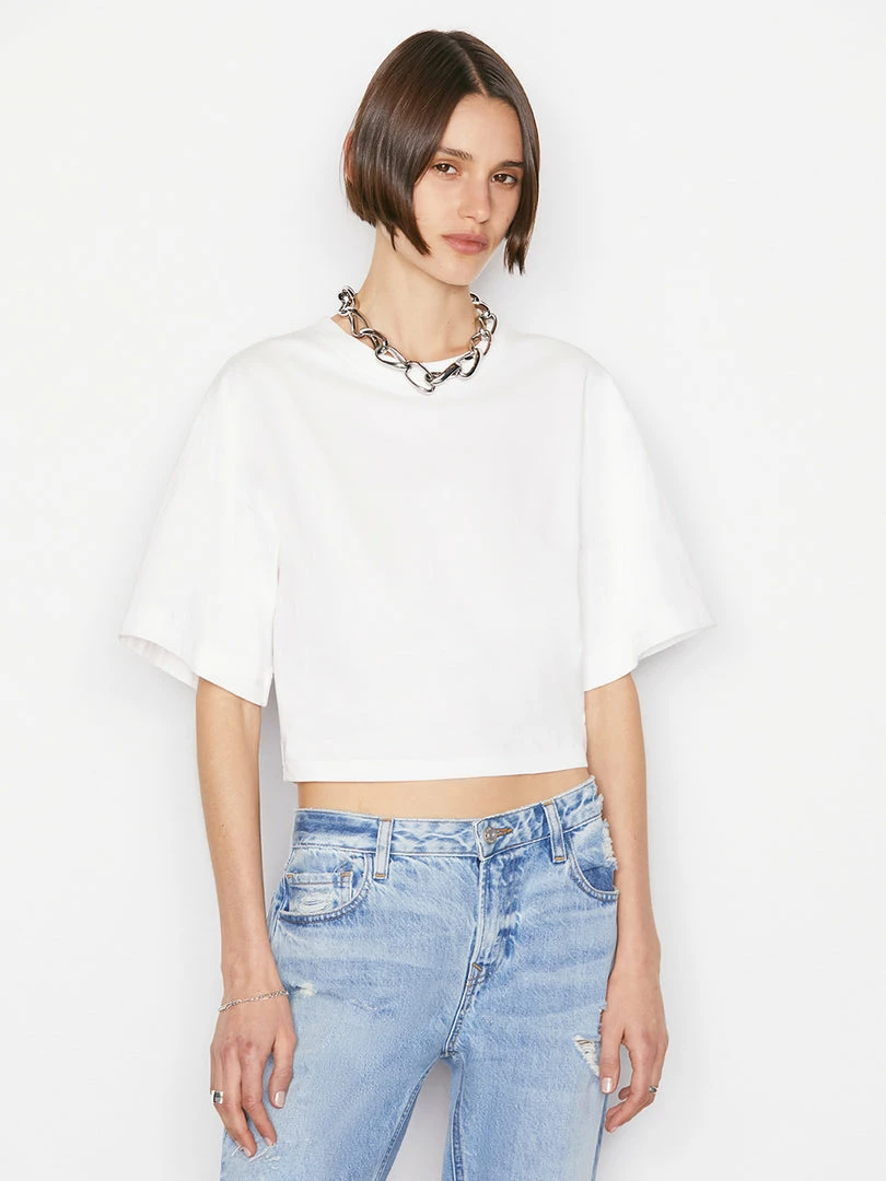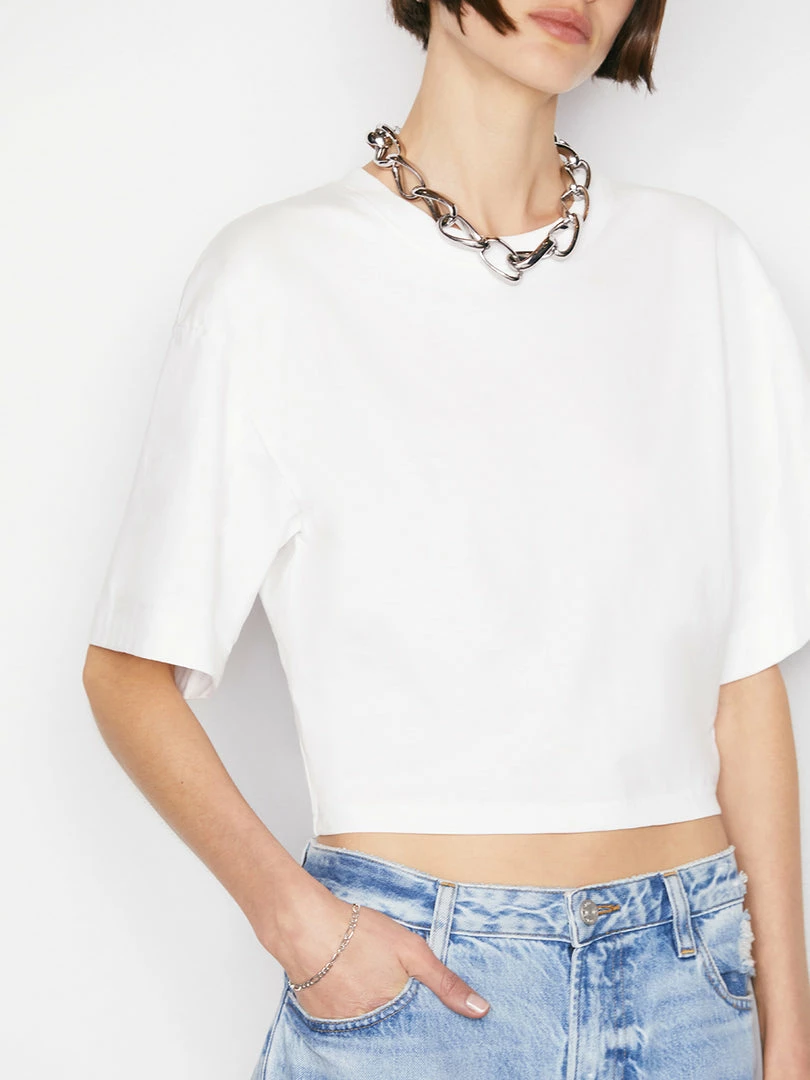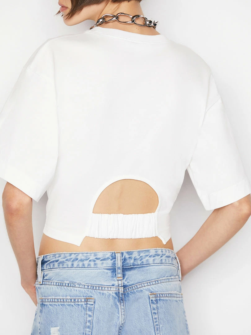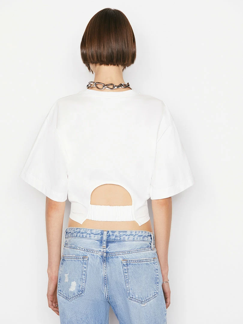 Upgrade your cropped tee collection with an unexpected take on the cutout trend. This crewneck tee is business in the frontβcrafted from organic cotton in essential Blancβbut thereβs a party in the back: a half-moon cut out leaves the lower back exposed, save for a wide elastic detail that ties the look together.