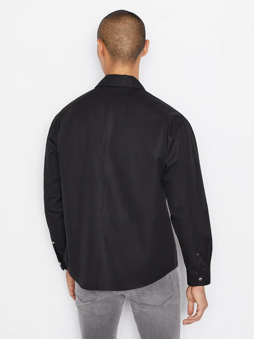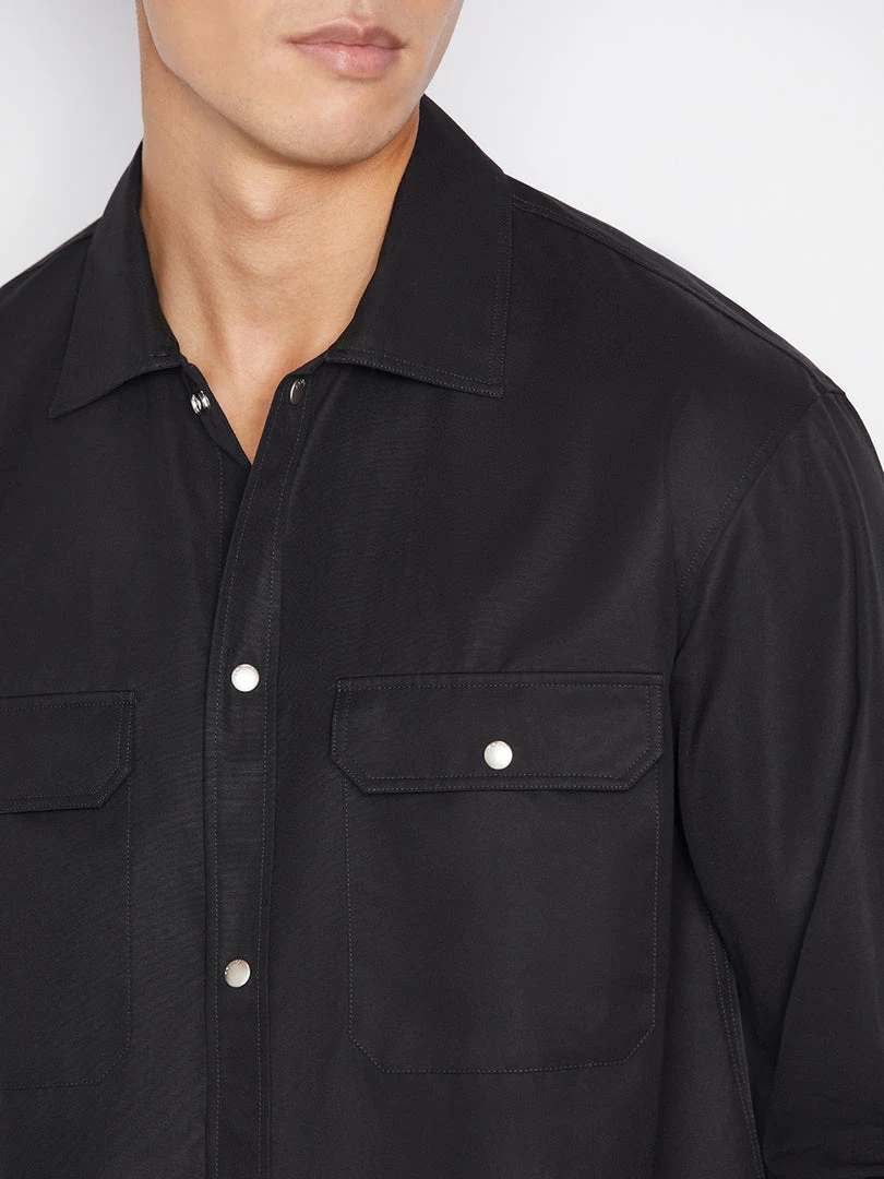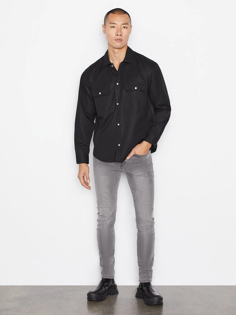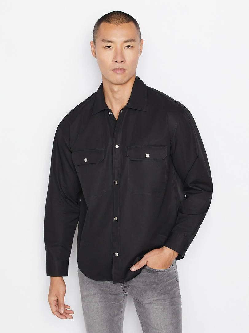 Woven from 100% cotton in Noir, this classic button down doubles as an overshirt layer in warmer weather. A slightly dropped shoulder, two front pockets, and the signature FRAME plaque subtly seamed on the back make this a style-forward all-season closet staple.