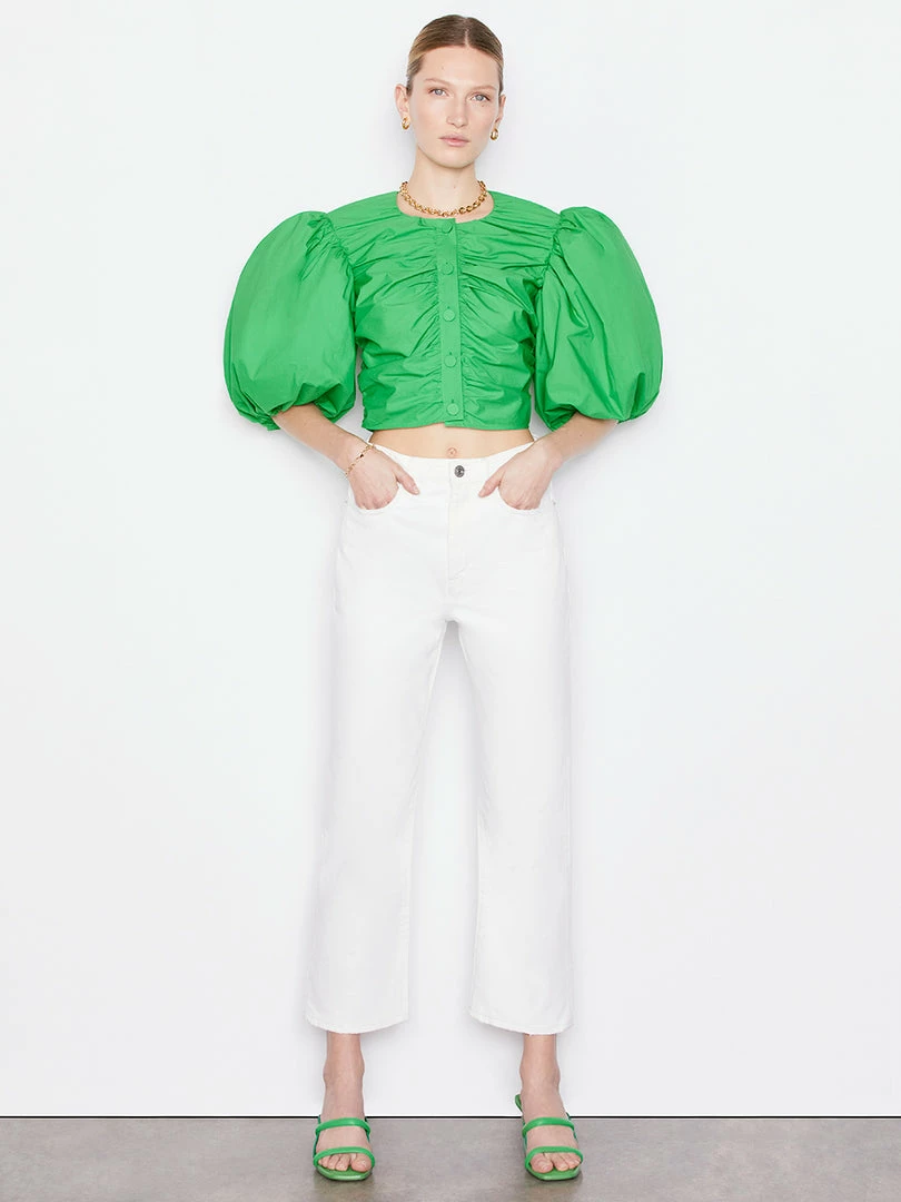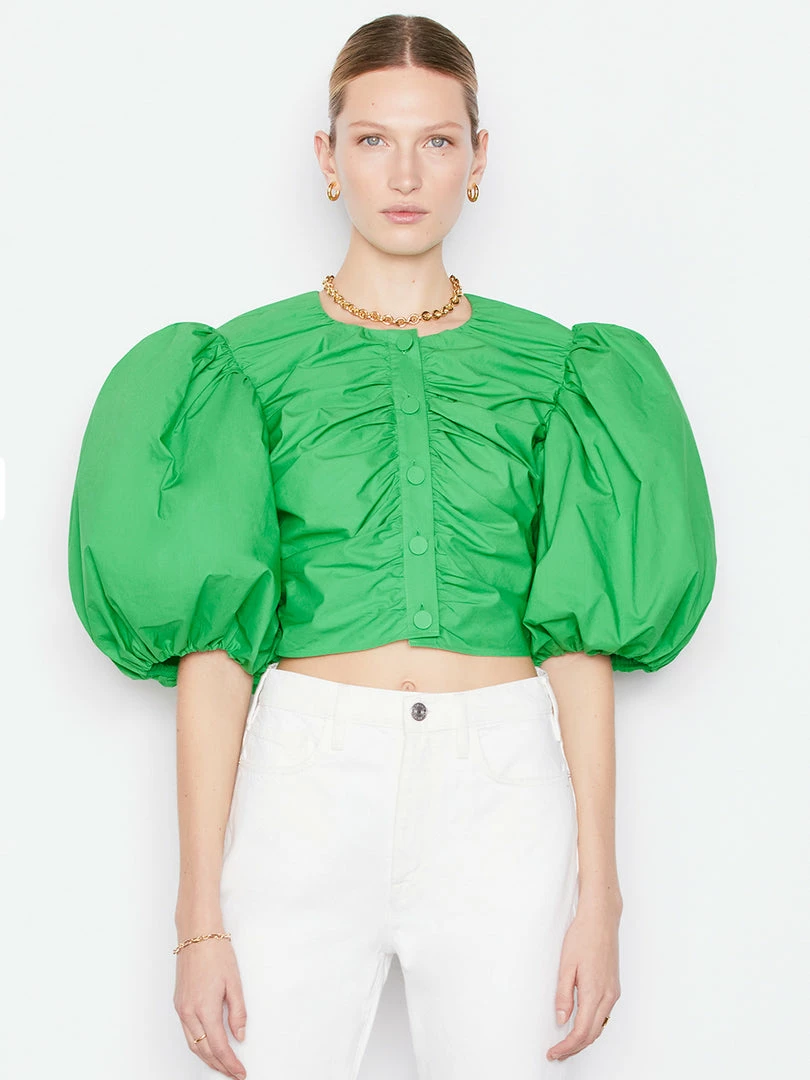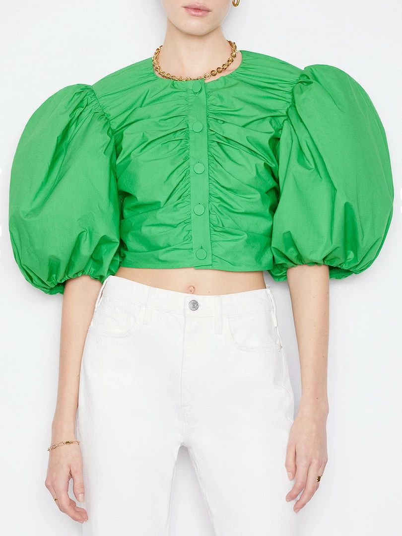 Shirred cotton enhances this expertly crafted top, lending added texture to an already eye-catching cropped silhouette. Gathered seams create voluminous puff sleeves, and meet a button-down placket for an overall feminine look. Pair this blouse with vintage-blue wash denim, or create a monochrome moment with Grass Green denim.