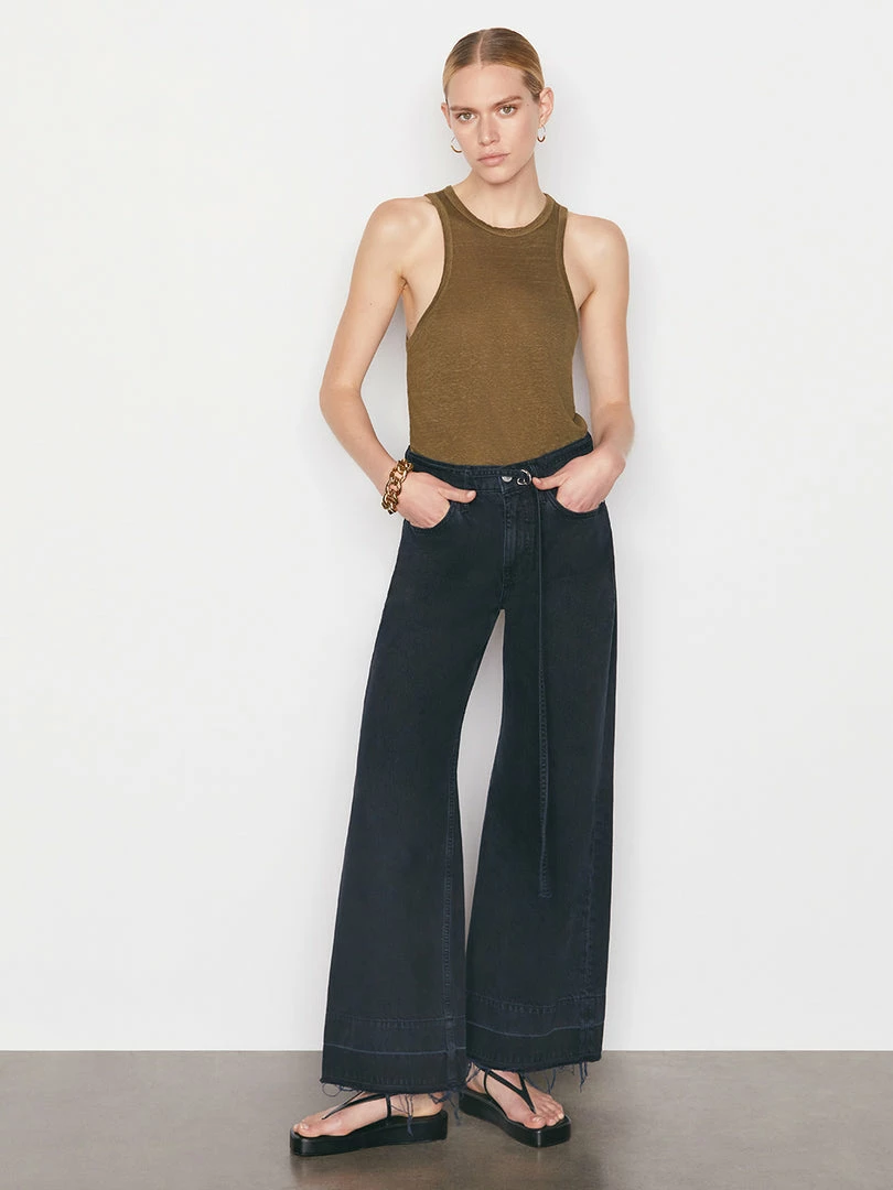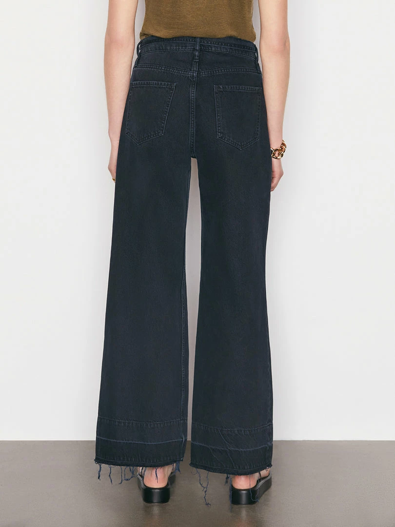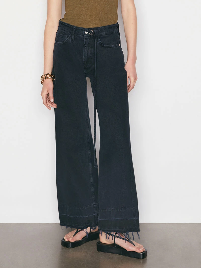 High-rise with a roomy full-length wide leg and slim, ‘90s-inspired matching belt, this jean features a vintage-black wash and raw hem. Expertly crafted from premium rigid denim made in Italy, for a flattering fit that pairs perfectly with cropped tees and crochet bodysuits.