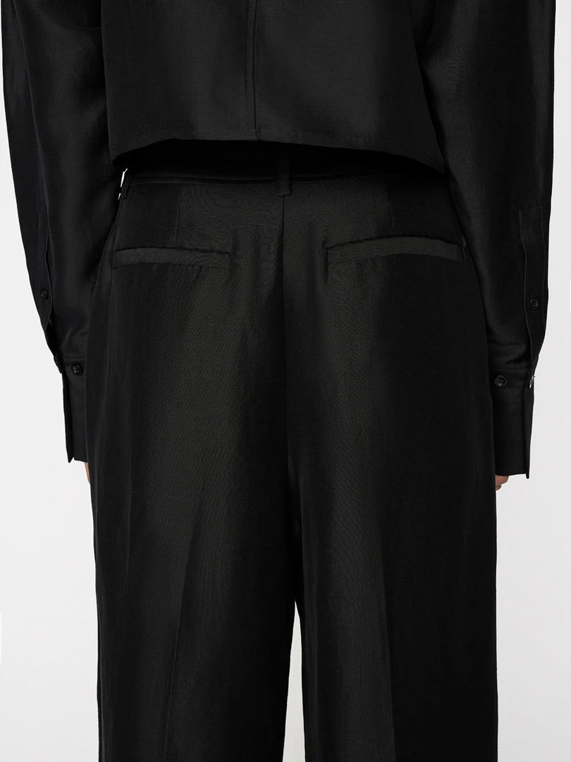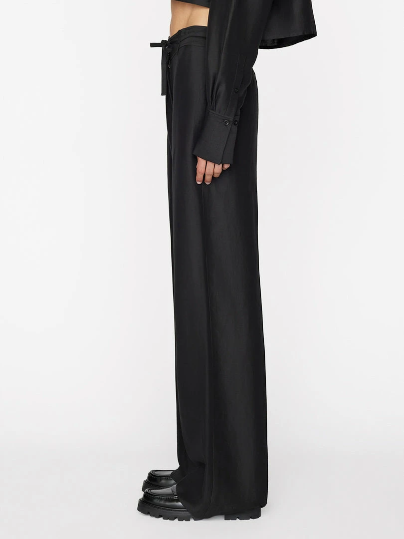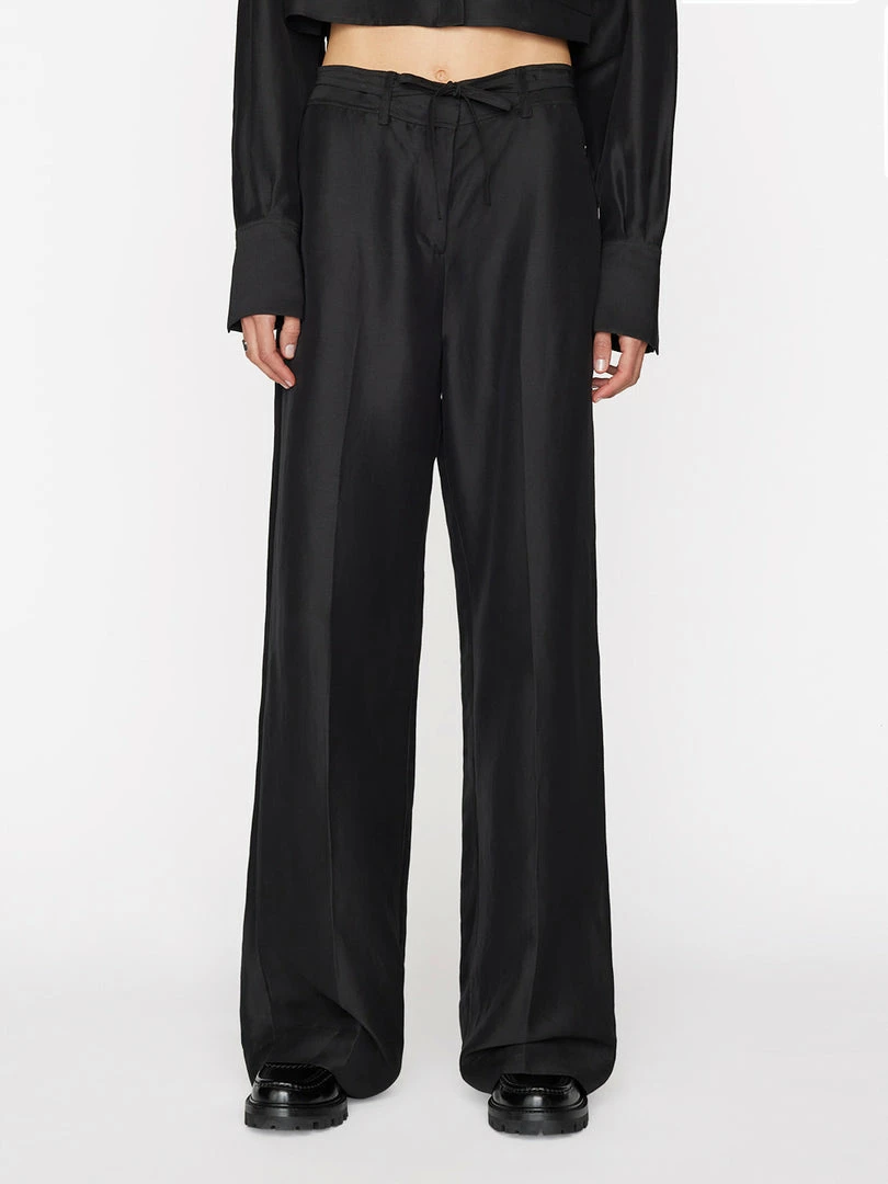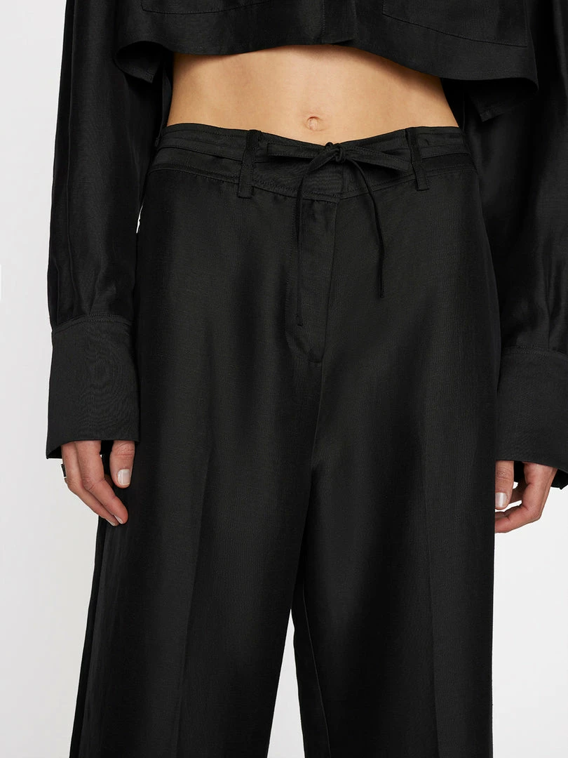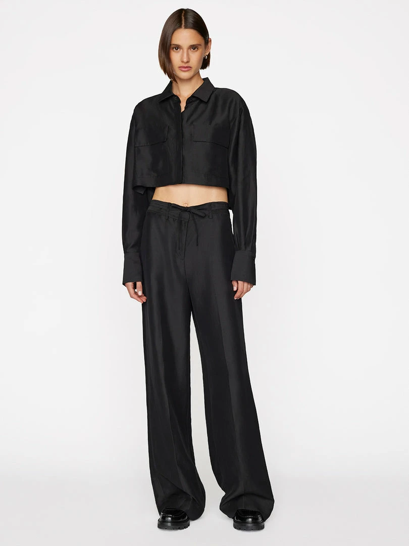 Utilitarian style that swings ultra chic. With a high-rise waist and a full-length leg that drapes beautifully at the ankle, this safari pant features a slight sheen and a tie-waist belt, for a elevated take on easeβparticularly when paired with the matching cropped safari shirt.