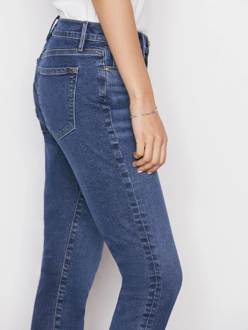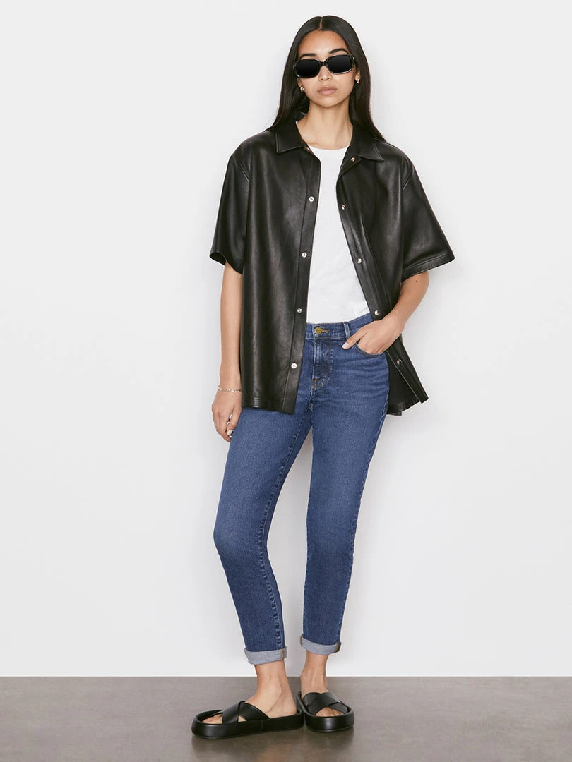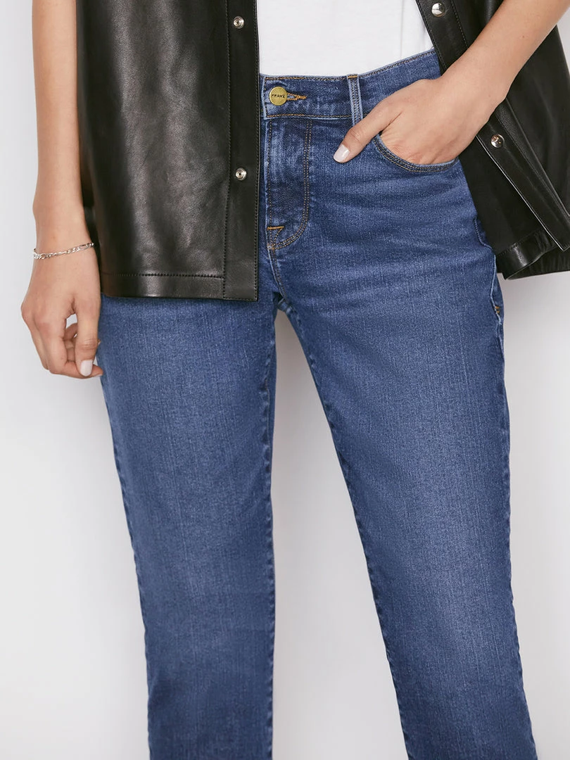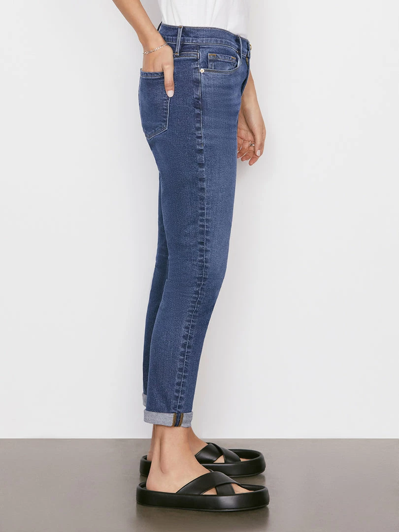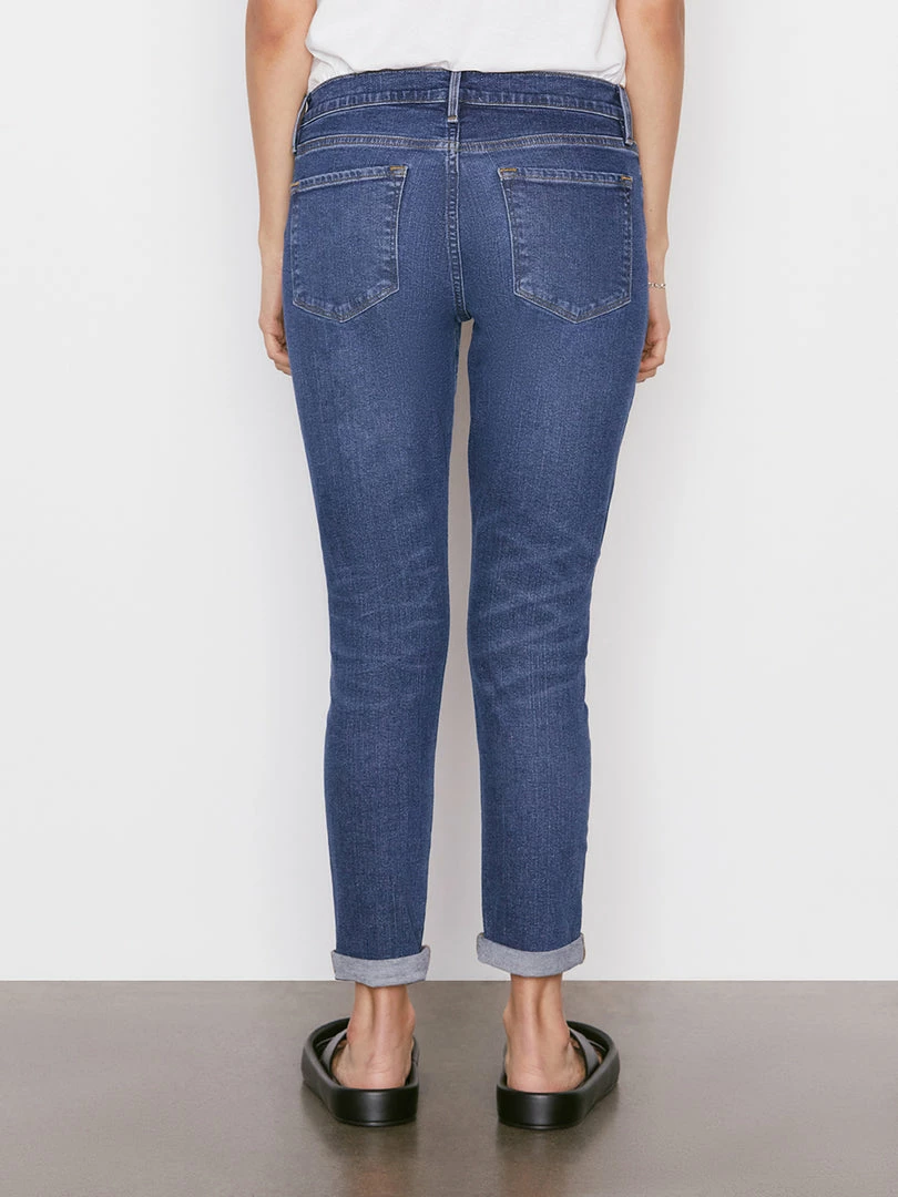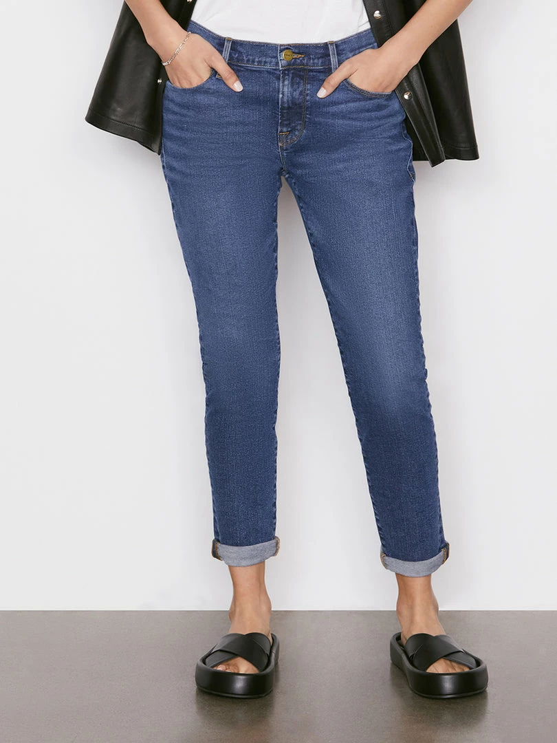 A coveted FRAME fit, this mid-rise jean is a slouchier take on the classic boyfriend silhouette. The curved waist features a slightly higher rise in the back, for a comfortable hip-slung fit. This pair features a clean, medium-blue wash and cuffed hem.