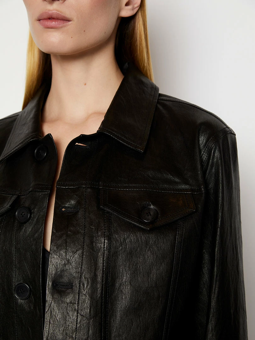 Supple, deep-black leather takes elevates the essential trucker jacket to a wardrobe hero that transforms your fashion uniform. Featuring two front pockets, tonal hardware, and a slightly cropped modern fit, this investment piece breaks in beautifully for a fit thatβs all you.Β