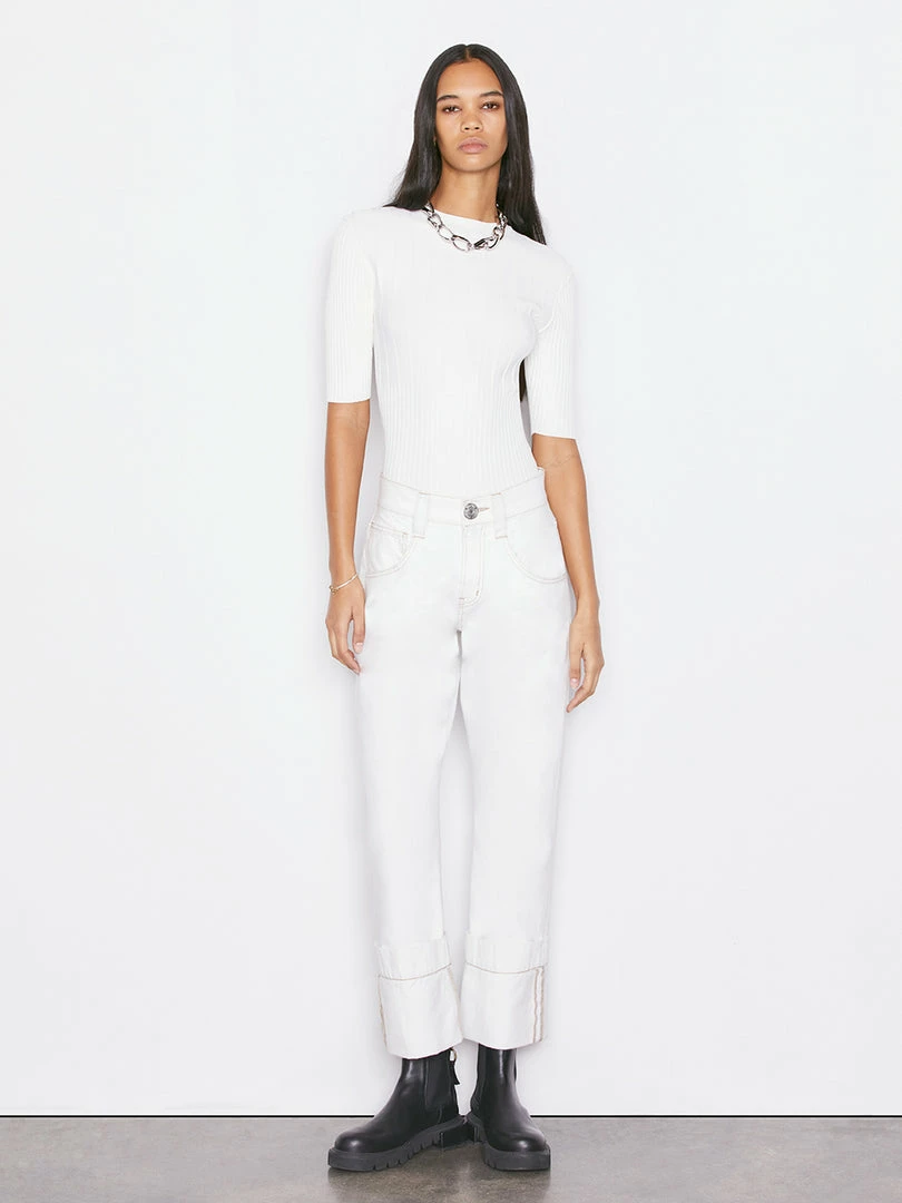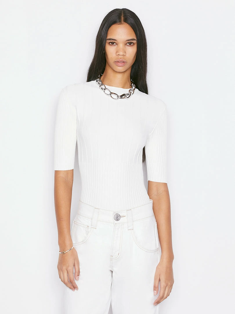 This ribbed knit starts wide at the shoulder and tapers into a microrib under the bust. Featuring an elbow-grazing sleeve length that fits under blazers without bunching, this sweater hits at the hip with a slim fit for streamlined tucking.