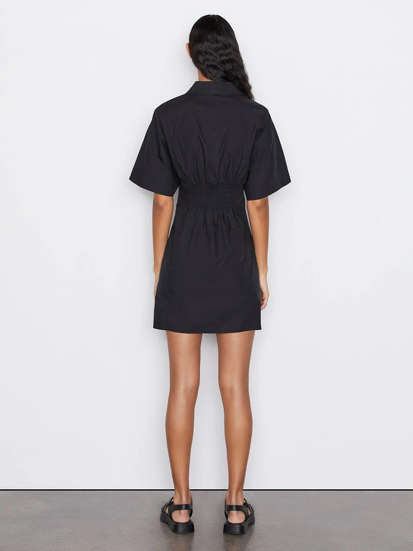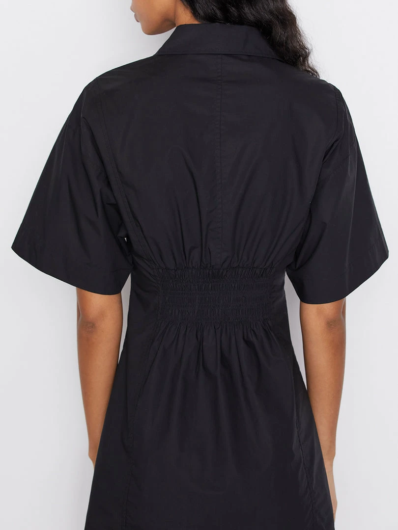 Vertical seams, crisp 100% organic cotton poplin, and a pointed collar give this minidress structure, while loose-fitting sleeves, stretch smocking at the back waist, and an a-line skirt keep the silhouette casual and comfortable. Unlined for versatility.