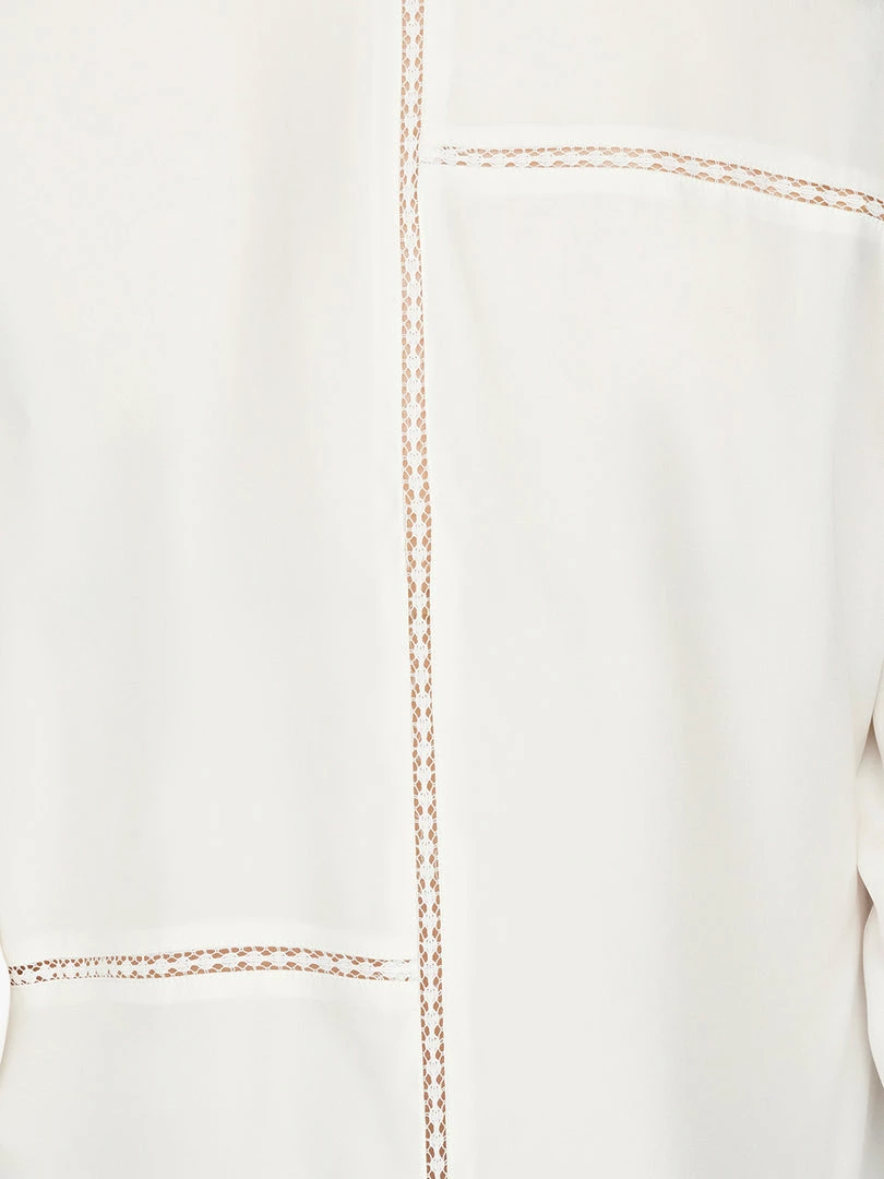 In off-white silk charmeuse with a matte finish, this collared shirt is endlessly versatile, but the tonal lace inset details make it stand out from your other button downs. With bell-sleeve cuffs and a full-length hem for tucking into trousers and denim, it’s ideal for office dressing and weekend looks alike.