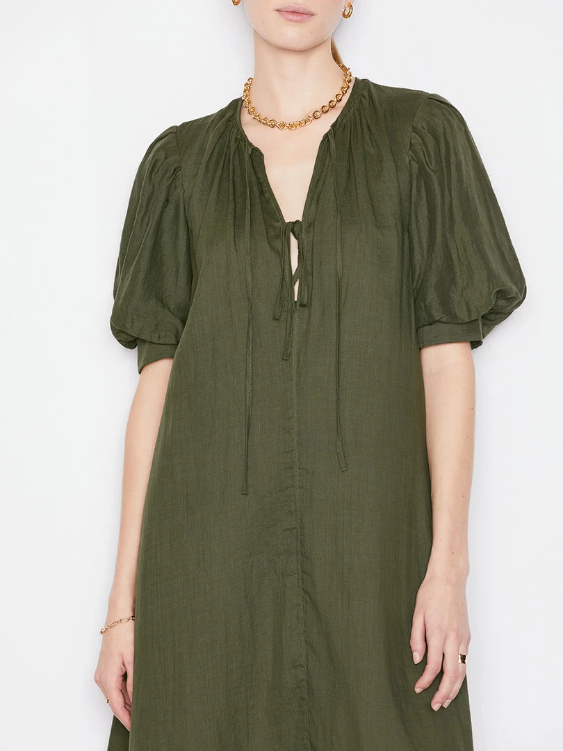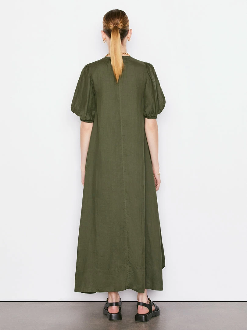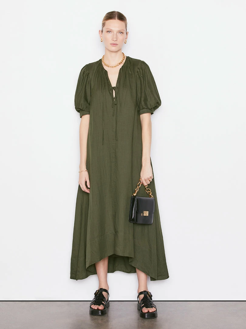 Romantic detailsβa pair of ribbon ties, voluminous puff sleeves, an ankle-grazing high-low hemβare balanced by an edgy, utility-inspired Fatigue colorway, for a modern take on feminine dressing. Crafted from lightweight ramie, this dress can be dressed up with heeled sandals, or styled with sneakers for a laid-back look.