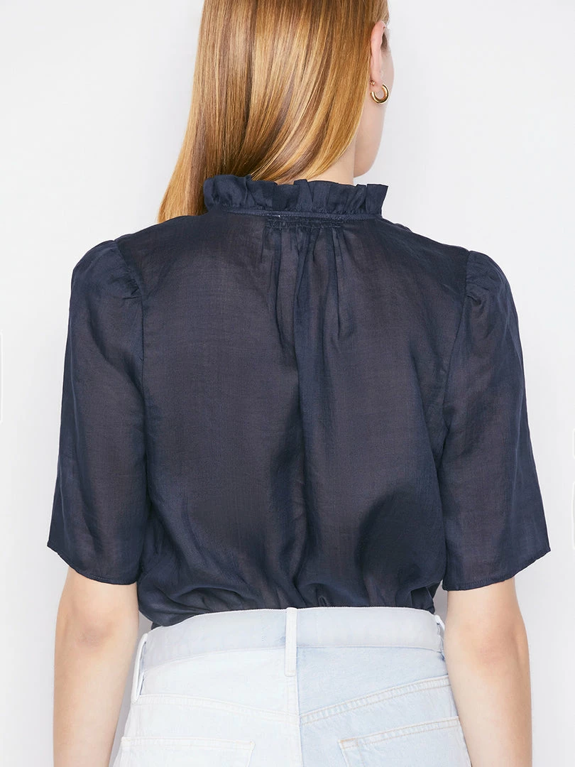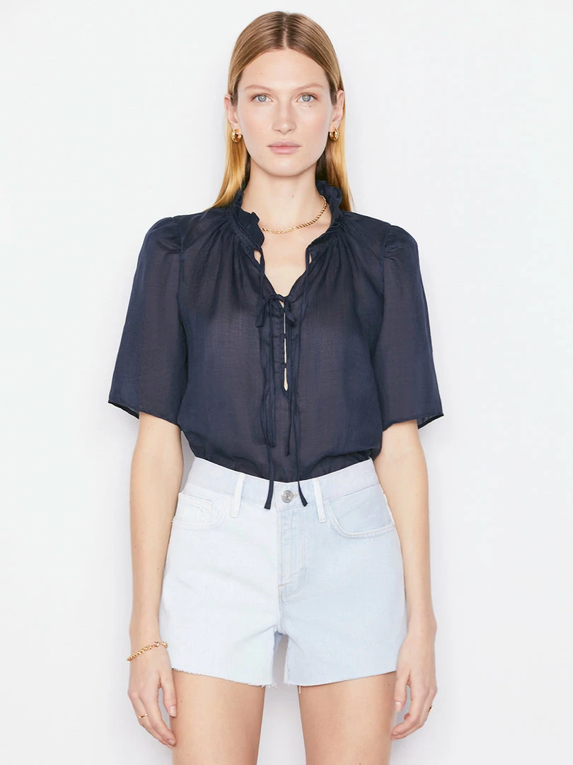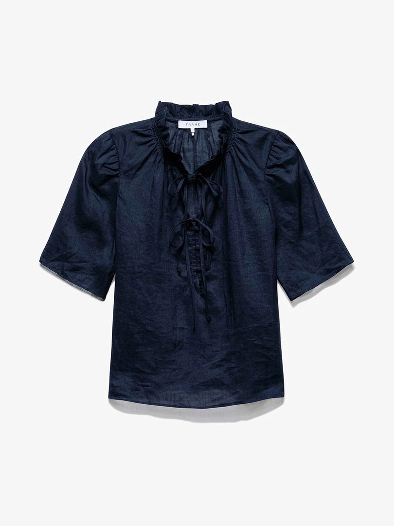Budget 𧨠Frame-denim Tie-Neck Ruffle Popover — Navy π