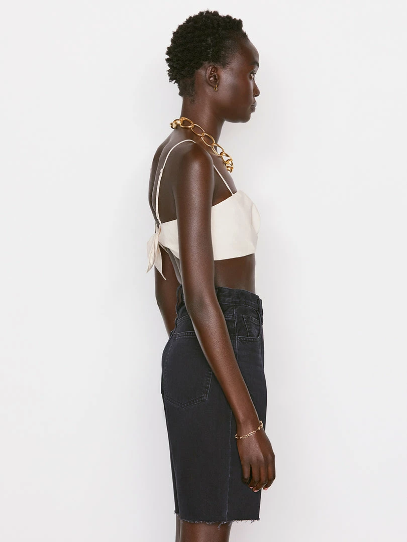 Crafted from shirting-weight poplin with a brushed softness, this bra top features a feminine twist-front details and a functional tie at the back. Adjustable slim spaghetti straps ensure the perfect fit. Style yours with the matching Lounge Shorts and Oversized Vacation Shirt.