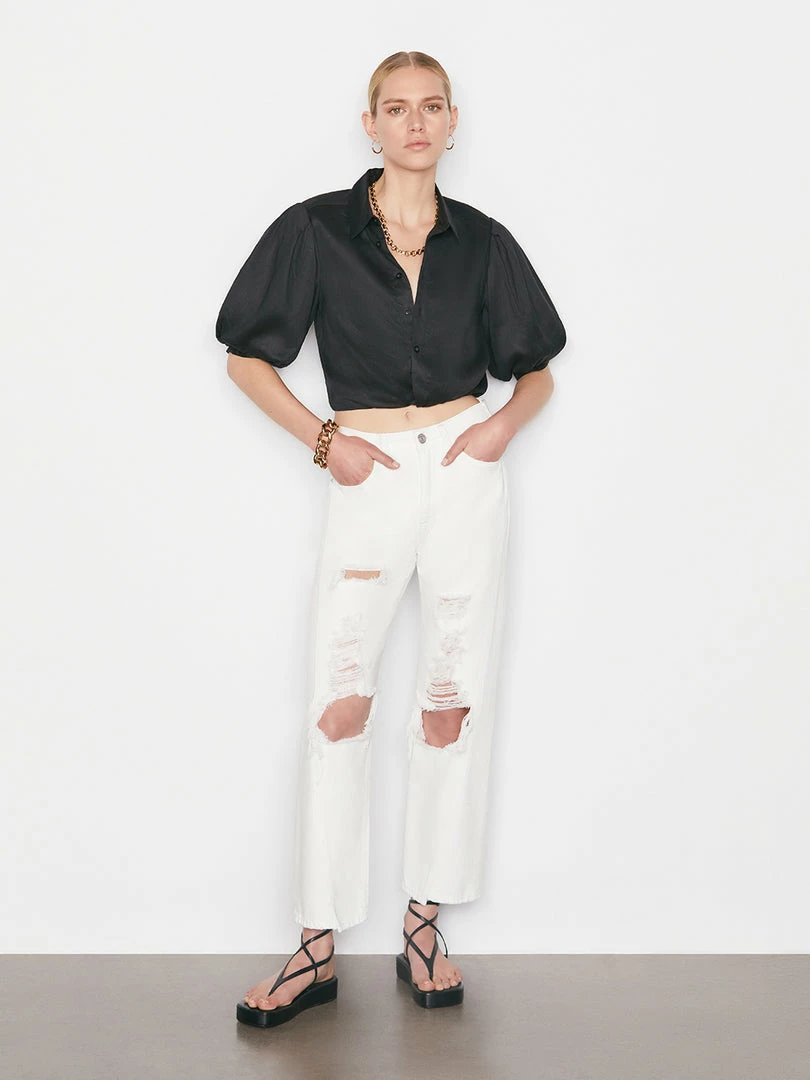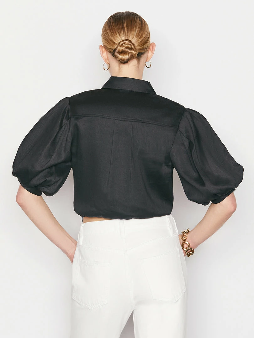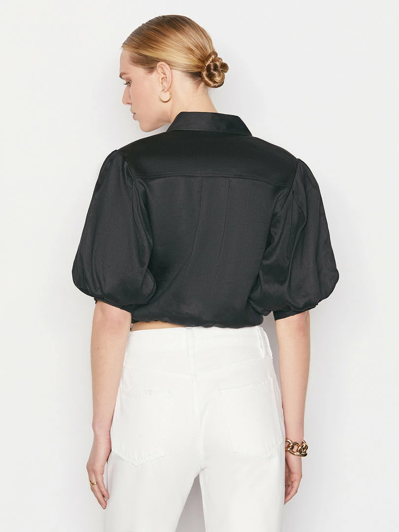 Crafted from a lightweight linen blend, this button-down shirt features a feminine puff sleeve and twisted front placket. With a flattering cropped hem and pointed collar, the silhouette complements high-rise denim and breezy maxis beautifully. Designed with a side zipper and smocked back panel for ease and comfort.