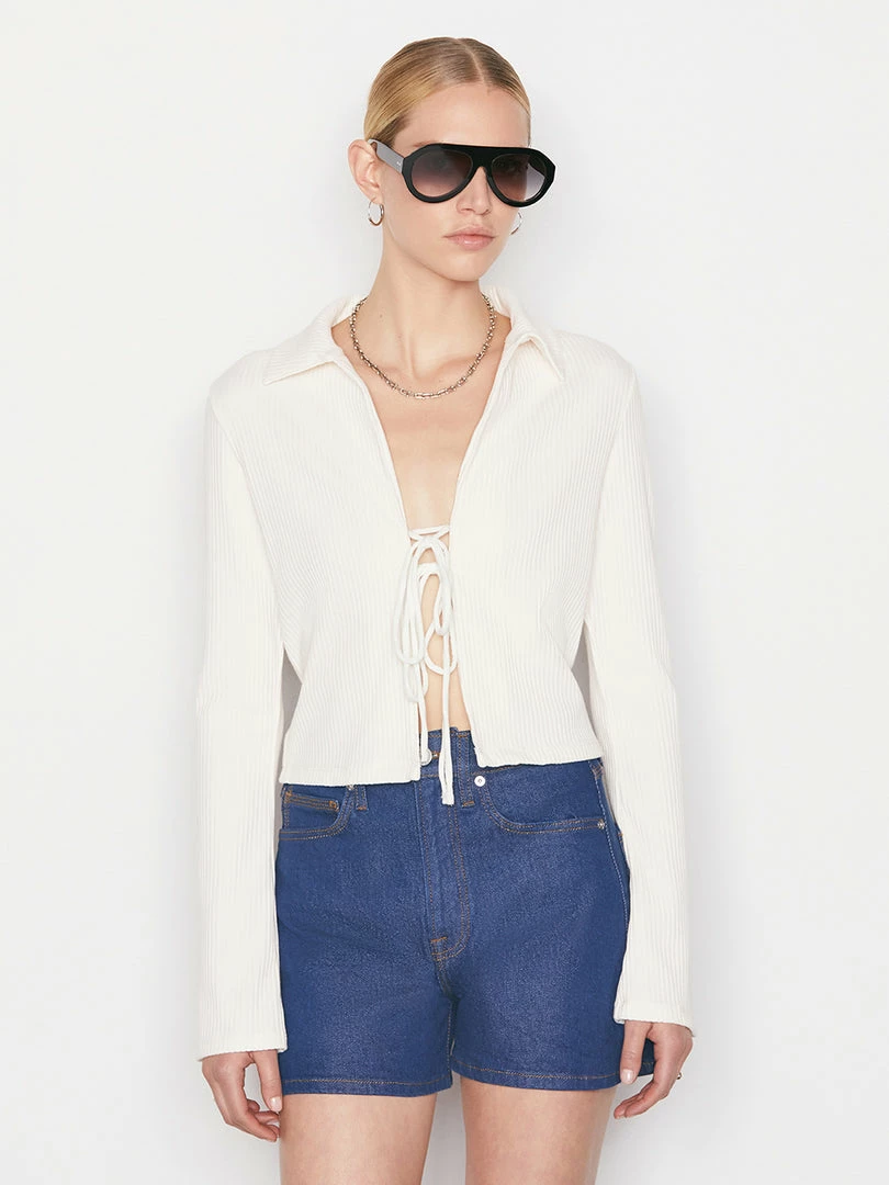 Luxuriously soft with a microrib texture, this cropped polo features two delicate ribbon ties. Style this piece solo for understated allure, or over a bodysuit or bralette to add feminine polish to your summer uniform. The flared bell sleeve gives this top a vintage feel, especially paired with wide-leg denim.
