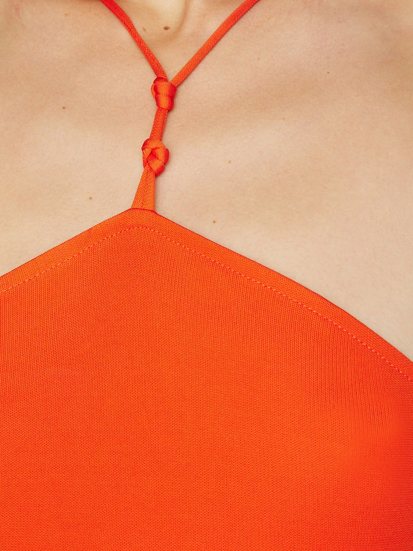 An elegant twist on the tie-strap trend that reigned all summer, this bodysuit is done in an occasion-worthy crepe fabric with a little sheen. A halter strap in the front and a v-style strap in the back are each delicately knotted for an elevated, artisanal feel.