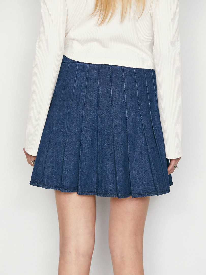 Hold court in this seasonβs take on the tennis trend. Cut from rigid denim made from sustainable materials and responsibly washed to a medium-blue hue, this pleated skirt sets you up for winning looks all summer long.
