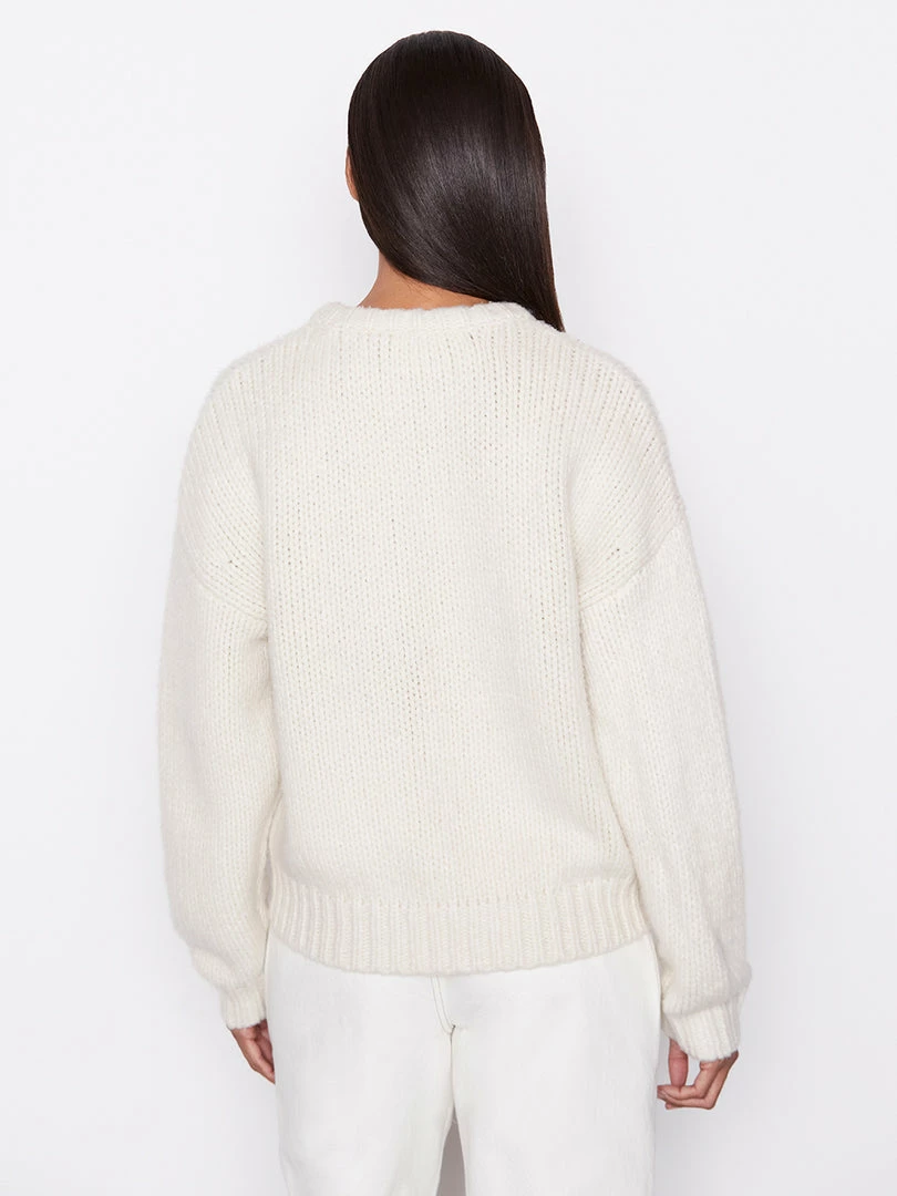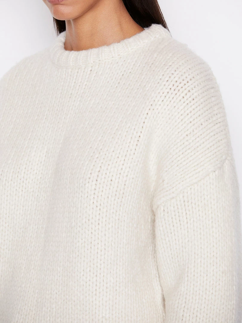 This off-white knit is a closet staple for effortless monochromatic moments, and creates a striking contrast with black leather trousers.Β With a borrowed-from-the-boys fit and outsized cuffs, hems, and crewneck, youβll turn to this chic essential year-roundβbut itβs especially cozy during cooler months.