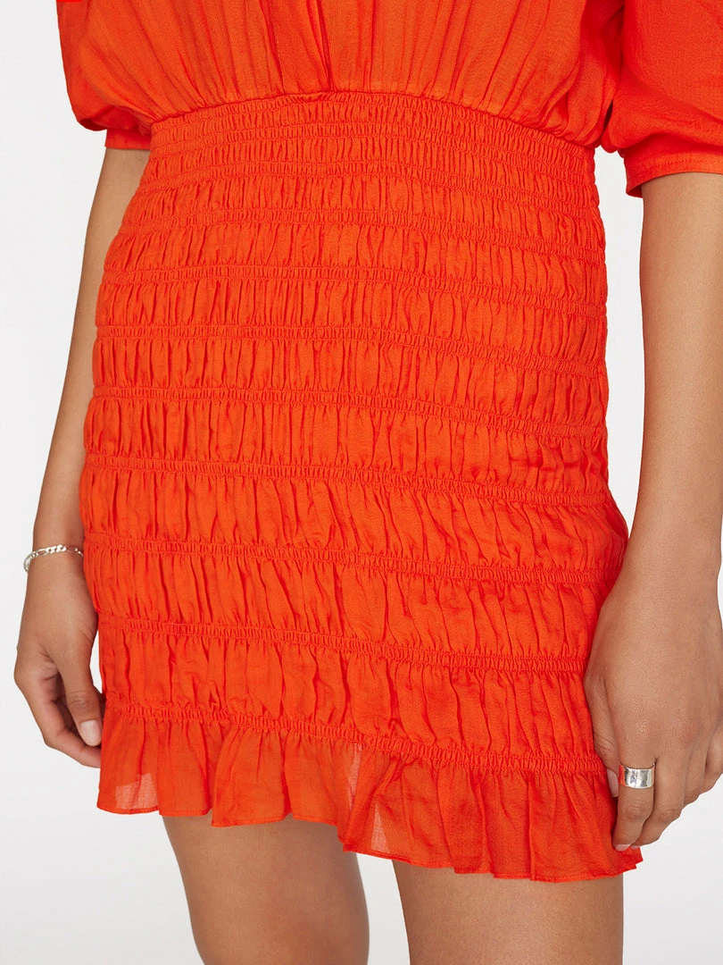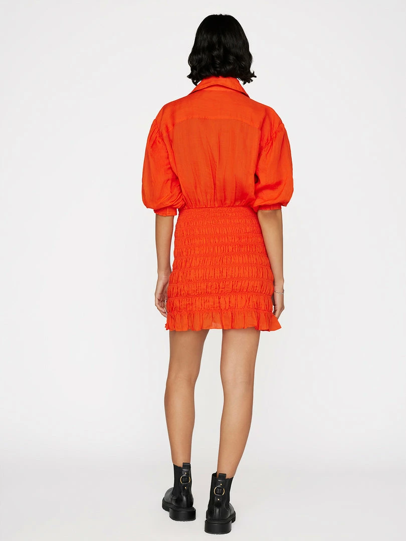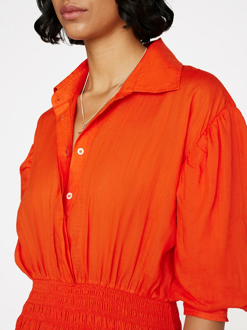 In lightweight, smocked ramie, this puff-sleeve shirtdress breathes feminine allure into your daily uniformβparticularly when styled with boots and a cardi for cooler temps. The skirt is lined and hits at the natural waist, and the shirt-style buttons can be done up or left open to reveal a bralette after dark.