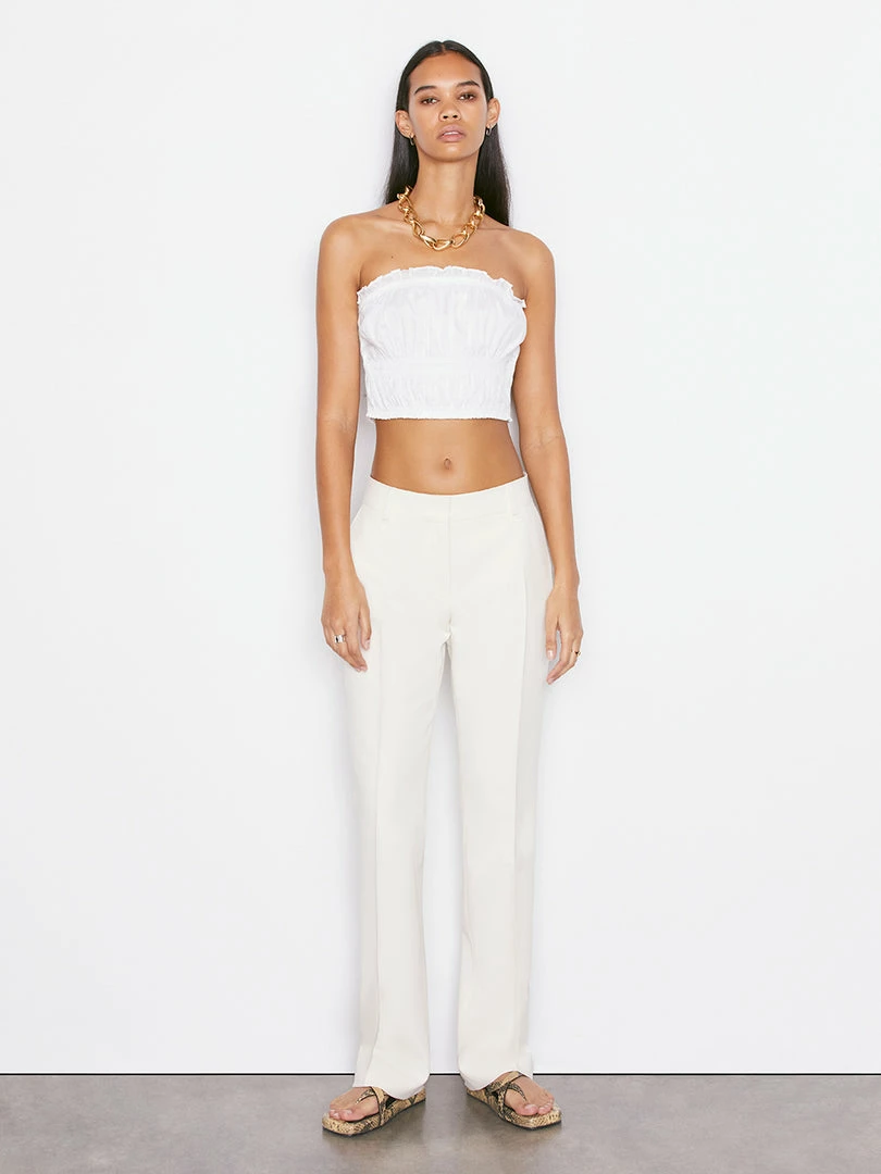 A summer essential in lightweight ramie, this strapless blouse features a ruffle across the top hem and smocking throughout the bust, for a flattering allure and versatile silhouette. Pair with the Gathered Seam Skirt for a fresh approach to party dressing.