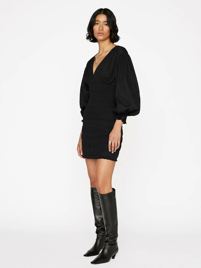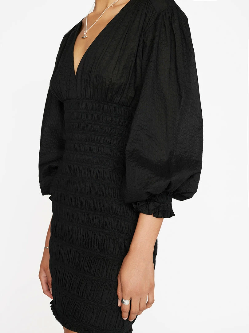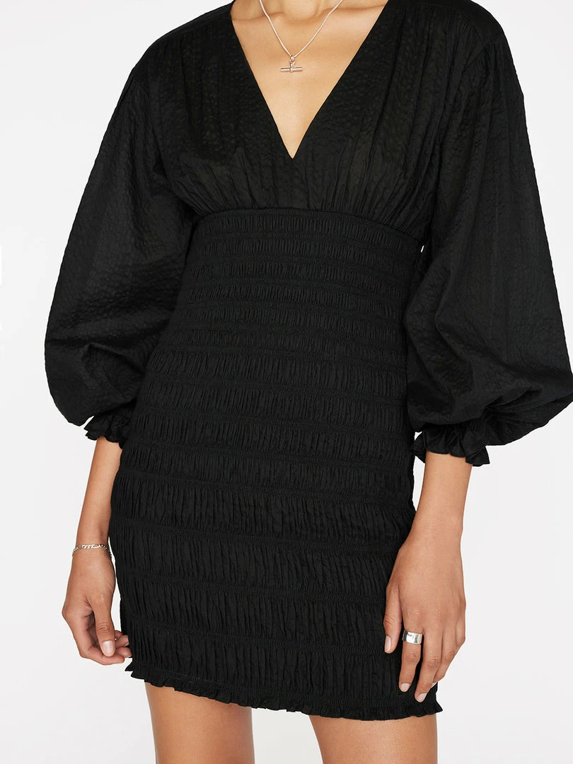 Crafted from textured cotton throughout, this v-neck mini dress balances a slimming smocked skirt with billowy puffed blouson sleeves and elastic cuffs.